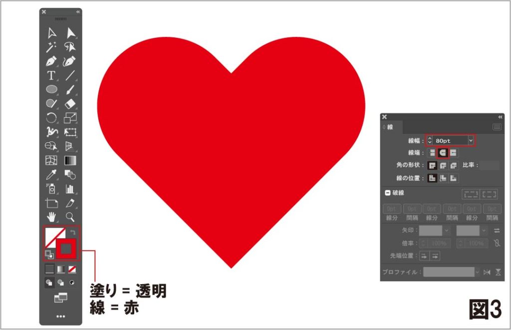 最後に塗りを透明、線を赤に変えて、線幅=80pt.線端=丸型線端を選べば、