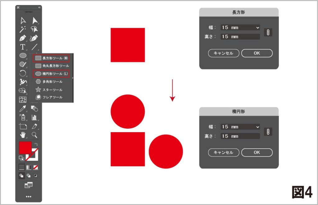 1.長方形ツールで15mm×15mmで正方形を描きます。
