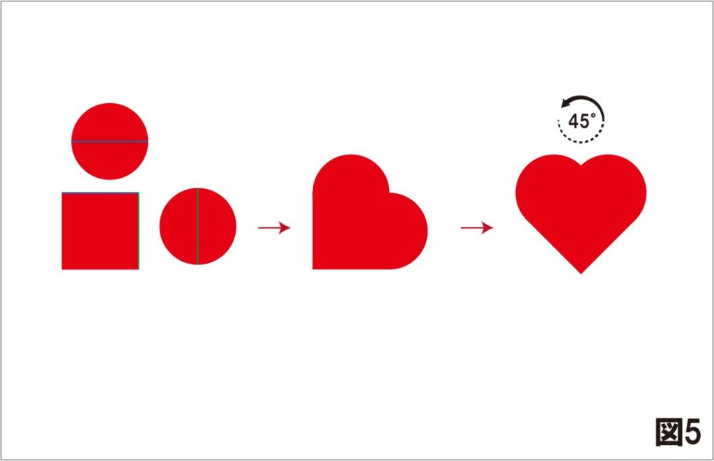 重なった図形を45°回転させれば3つ目のハートの完成です。
